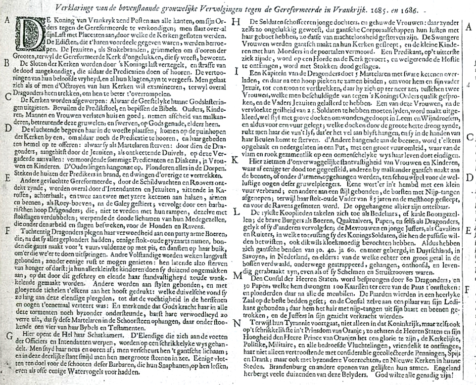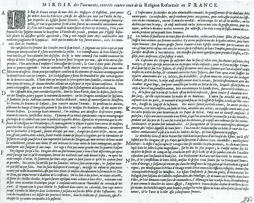 Tafel 1 stellt das zerstörerische Wirken der Soldaten König Ludwigs XIV. dar, das von der katholischen Kirche (Jesuiten) geduldet und angefeuert wurde. Romeyn de Hooghe hat unter der nicht von ihm signierten Tafel von 1686 in zwei Kolumnen in niederländischer und französischer Sprache die Einzelszenen detailliert beschrieben. Dabei ist auf den Bildern nicht alles nachzuvollziehen, was der Künstler beschrieben hat.
