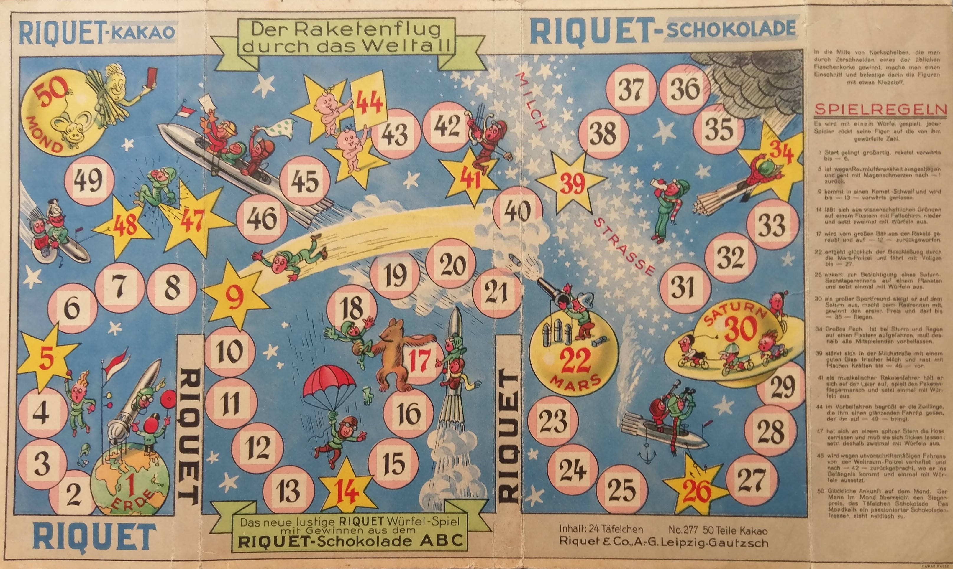 (21 von 21) Riquet & Co. Leipzig-Gautzsch, Der Raketenflug durch das Weltall. Das neue lustige RIQUET Würfel-Spiel mit Gewinnen aus dem RIQUET-Schokolade ABC, Halle um 1927 - Bild vergrößern